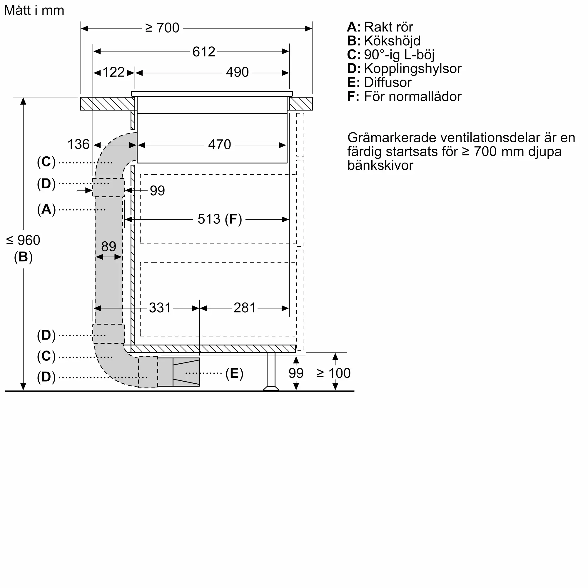 Startkit för delvis kolfilterdrift med fläktkanaler för hällar med integrerad fläkt. Passar kök med bänkskiva 70 cm (eller större).
